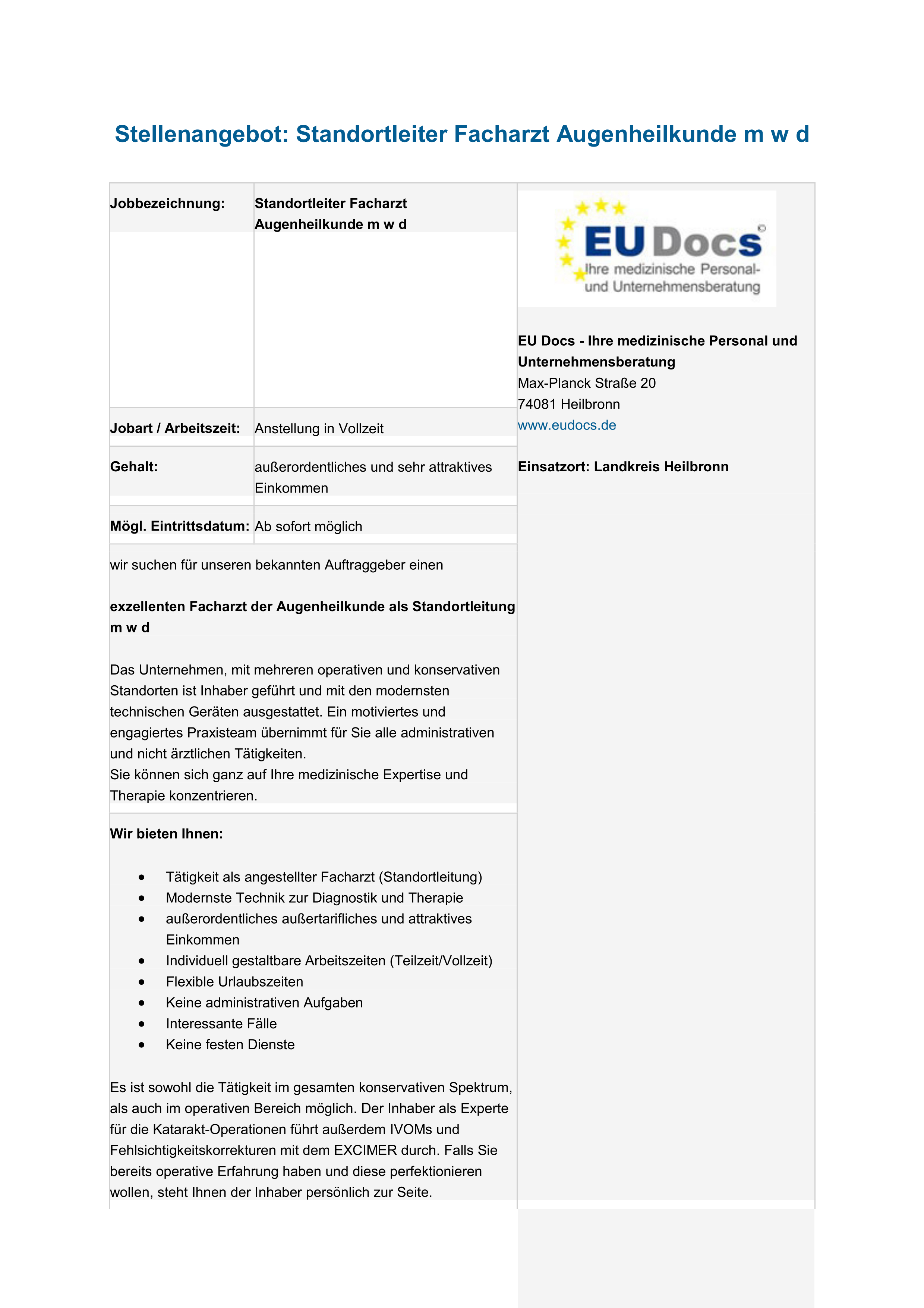 TOP JOB: Oberarzt FÄ/FA für Augenheilkunde, oper. u/o konservativ zur Mitarbeit